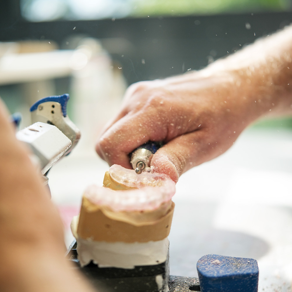 Das ist unser Dentallabor. Hier entstehen Zahnersätze, es werden Schienen gefertigt und manchmal retten wir mit schnellen Reparaturen den Tag. Alles mit ruhiger Hand, mit Liebe zum Detail und ohne viel Aufhebens.